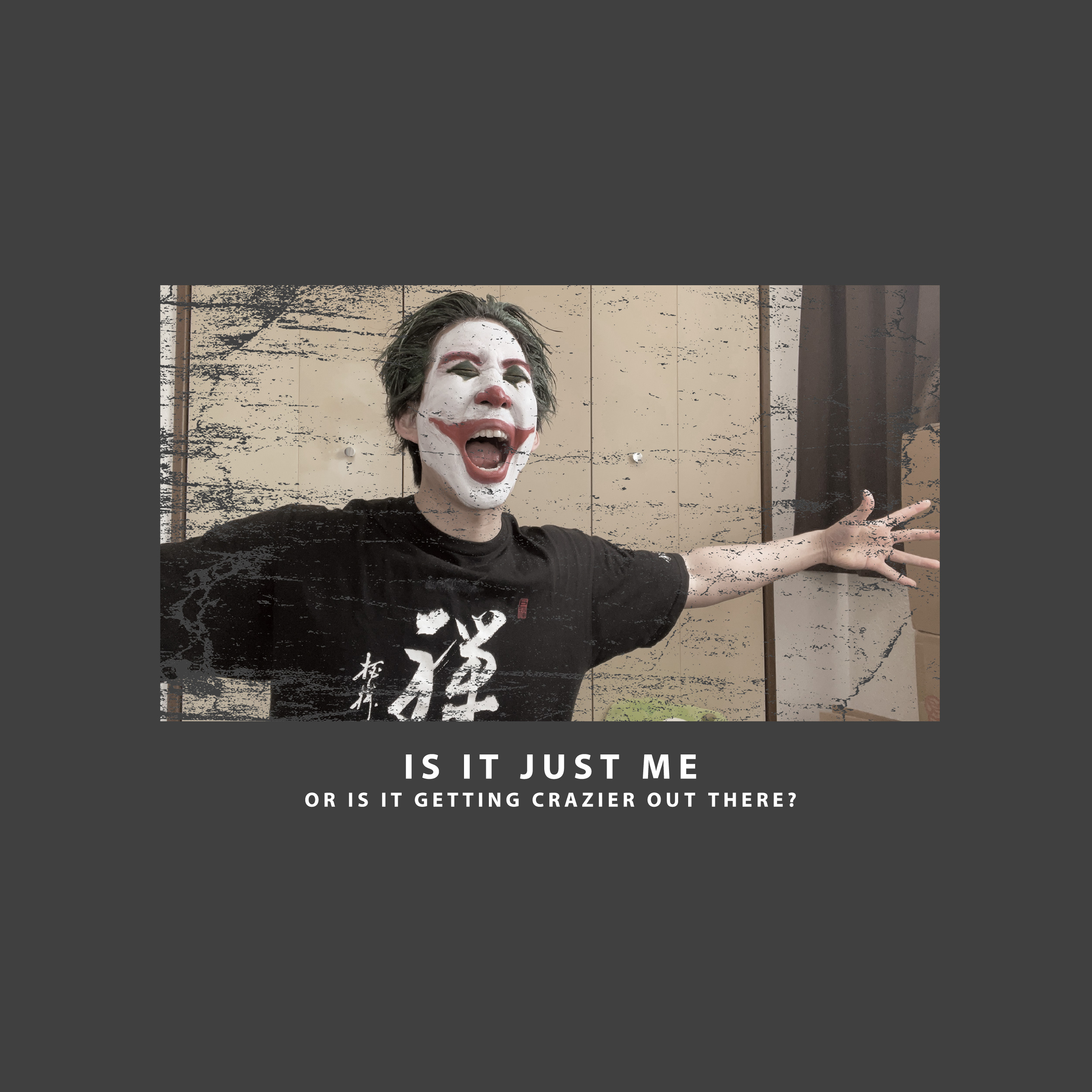 ジョーカーの画像に「Is it just me, or is it getting crazier out there?(訳:狂ってるのは俺なのか?)」がプリントされた非モテ系Tシャツ